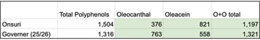 Healthy extra virgin olive oils typically have high oleacein + oleocanthal together (“the secoiridoid signature”). Below is how Onsuri and The Governor's 25/26 harvest numbers compare.