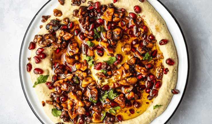 Pop the Hummus into a bowl and create a well in the middle. Pour topping into the middle of the well and then lighlty dizzle across the top of the hummus. Sprinkle some more pomegranate seeds and walnuts for effect. Serve with toasted baguette slices, pita chips or fresh veggies for a healthy, nutritious snack